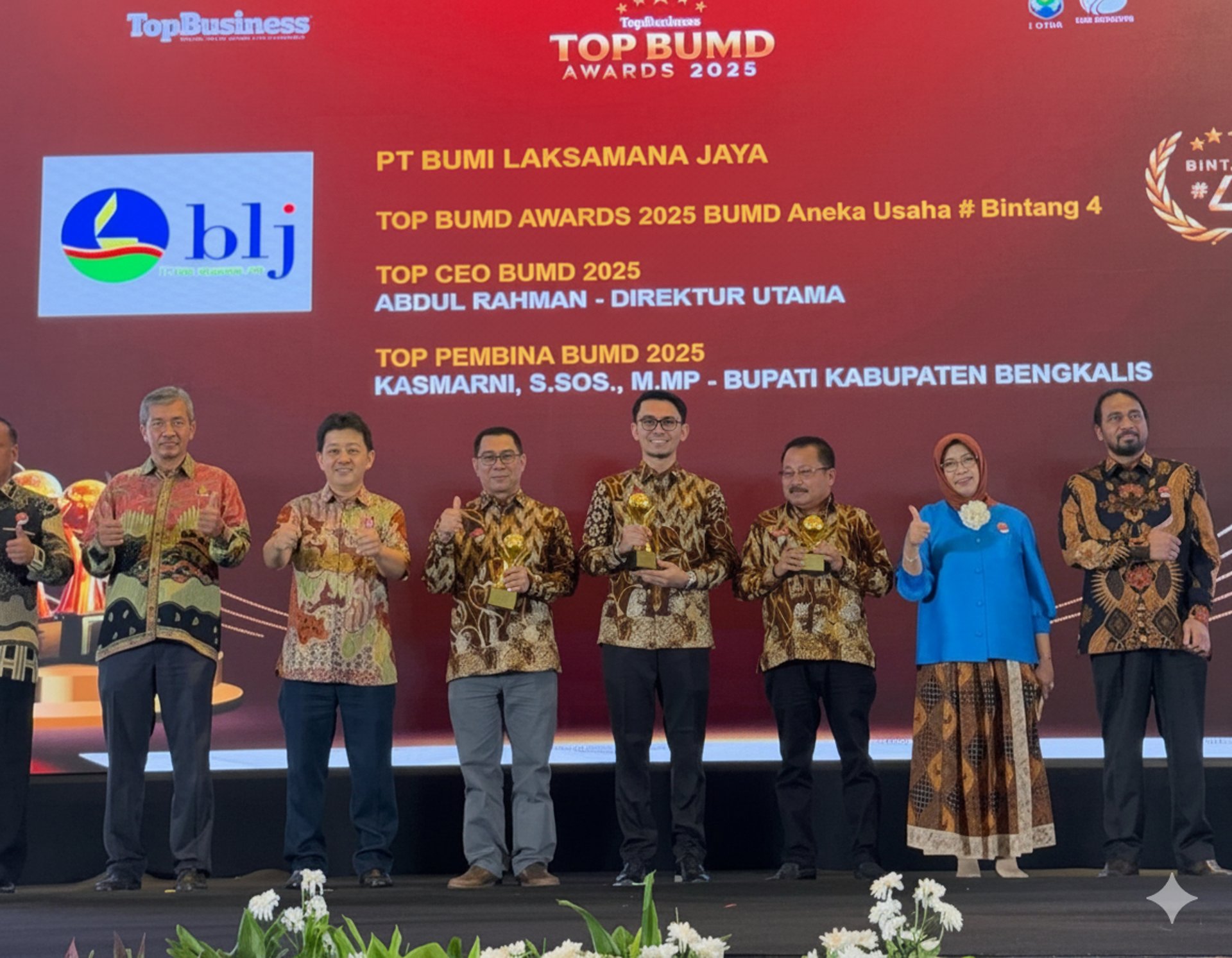 PT Bumi Laksamana Jaya (BLJ) adalah BUMD Kabupaten Bengkalis yang berdiri pada 6 Desember 2001 dengan kepemilikan penuh Pemerintah Daerah. Kini BLJ hadir dengan semangat baru sebagai Holding Company yang profesional, berdaya saing, serta berperan sebagai penggerak ekonomi daerah yang bergerak di bidang pembangunan, pertambangan, industri, perdagangan, dan jasa, termasuk pengelolaan SPBU, pertanian, konstruksi, pergudangan, transportasi darat dan laut, serta energi. Kantor pusatnya berlokasi di Komplek SPBU Jalan Panglima Minal, Desa Air Putih Bengkalis.